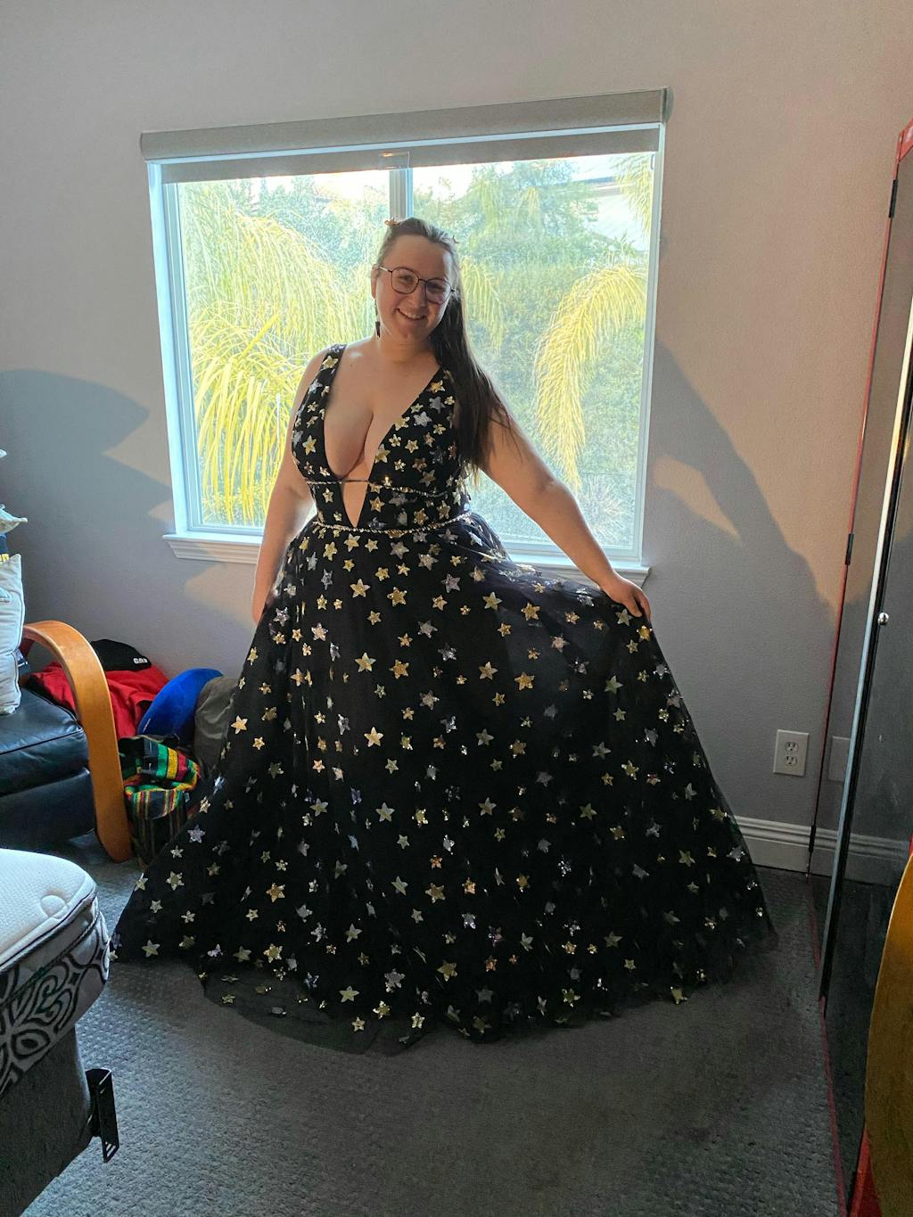 This dress is the ultimate princess dress of my dreams! I got it in a tea length to be able to wear it to Disneyland comfortably and it was absolutely stunning. The fit is perfect and it was a showstopper all night long. It will absolutely leave a trail of glitter behind you everywhere you go, but that was a huge PLUS for me!