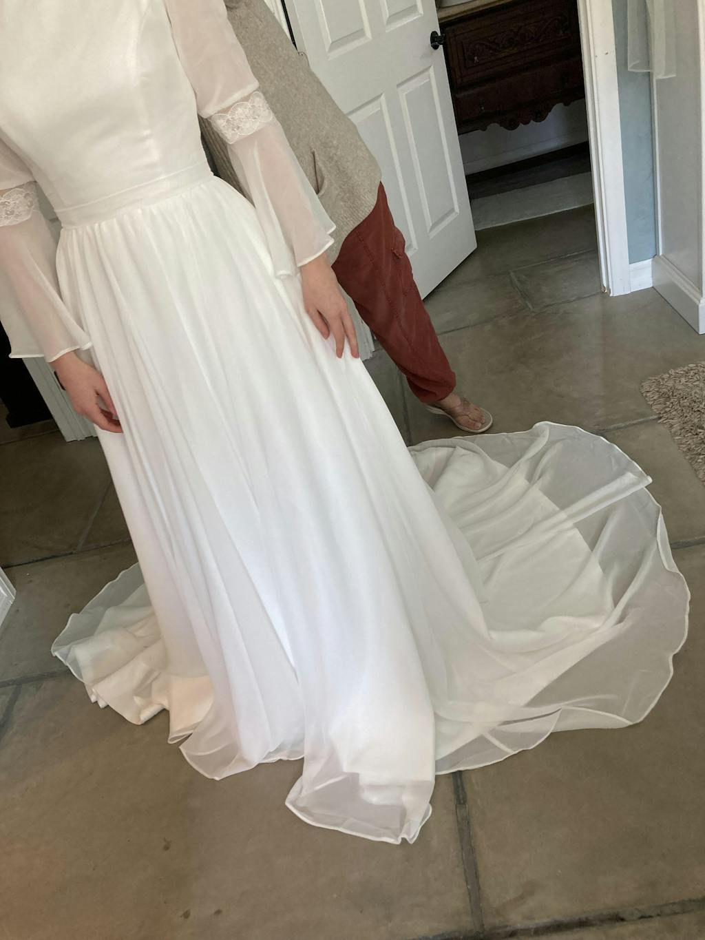It took much longer than expected to get to me, almost three weeks, but the quality was perfect, and the details were lovely. There are no pockets as shown, and the lace is slightly different, but the copy work is very good.